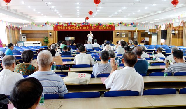 紧接着开展了诗歌朗诵会,朗诵会由离退休工作处党委书记王雪琴主持。离退休各个党支部推送了七个朗诵节目,内容丰富,包括“发扬红船精神,坚定红船理想”、“毛主席诗词:沁园春.雪”、“因为有你,致敬新时代伟大的中国共产党”、“歌唱七月--献给党的生日”、“仰望星空”、“信念永恒”、“东方红”等。老同志们通过诗歌朗诵的方式歌颂我们伟大的党、歌颂美丽的祖国、歌颂美好的新时代。各位参赛选手精神矍铄,朗诵时声如洪钟,抑扬顿挫,诵到动情之处则振臂挥袖,慷慨激昂。充满激情的歌颂,表达了广大离退休党员对党的无限热爱和深深祝福,他们拥抱新时代,牢固树立“四个意识”,坚定“四个自信”,永远跟党走。