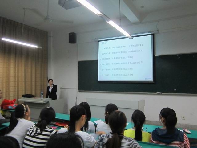 为进一步加强专业思想教育,10月12日晚,人文与管理学院在西教学楼106举办保险行业发展前景与保险学专业就业方向专题讲座。本次活动由保险学教研室组织,太平洋人寿保险股份有限公司(CPIC)无为县支公司经理解钢主讲。人文与管理学院2013级辅导员张欣慧、保险学教研室卞呈祥、2013级保险专业全体同学参加本次讲座活动。本次讲座由保险学教研室卞呈祥老师主持。