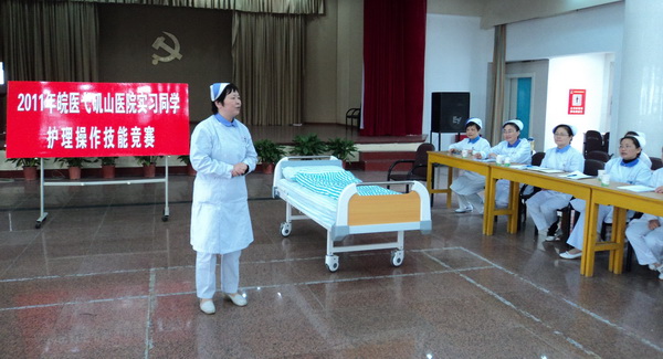 2011年皖医弋矶山医院实习护生技能操作大赛,通过片内层层选拔,最终21名选手脱颖而出参加决赛。决赛于2011年11月22日在血液净化中心5楼举办。护理学系副主任李远珍,基础护理教研室副主任邢彩霞,实验中心副主任沈学,护理部副主任吕建萍、唐丽玲和部分临床护士长担任评委。