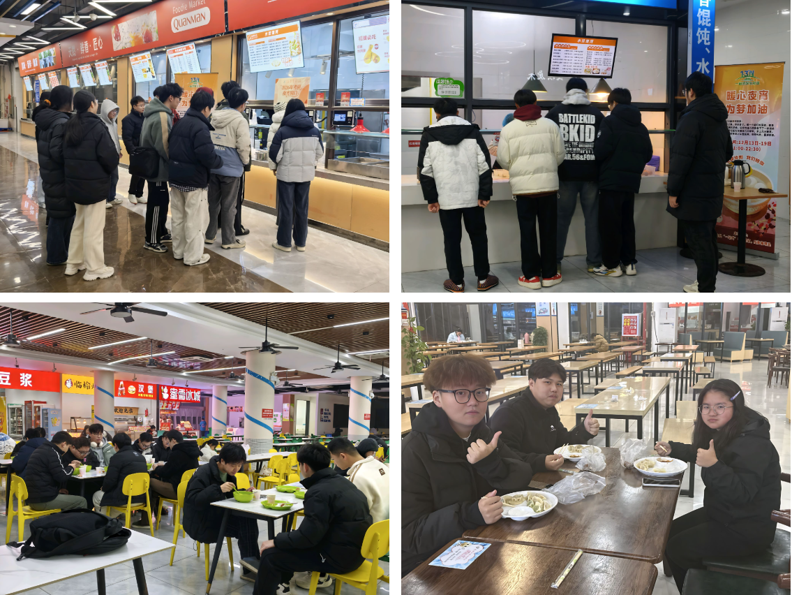 夜幕降临,食堂的灯火却依旧明亮。为服务考研学子备考期间的夜间学习需求,每日晚21:00-22:30,各食堂一楼专设“考研暖心夜宵窗口”,免费为复习到深夜的同学们送上热气腾腾的餐饮支持。夜宵窗口提供的不仅是暖胃的餐点,更是一份持续到深夜的陪伴与支持,让学子们在紧张的备考路上,感受到来自校园的温暖与守护。