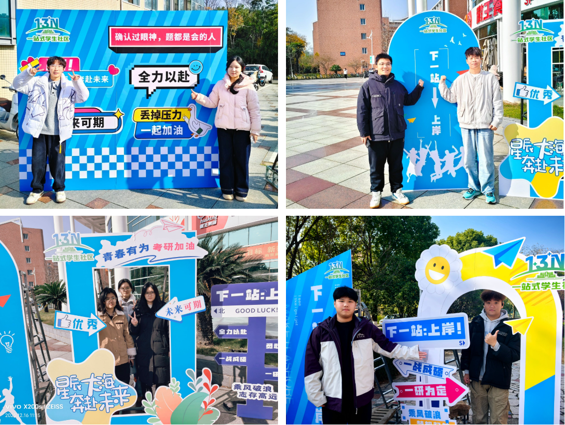 为丰富考研学子备考期间的校园文化生活,营造积极向上的冲刺氛围,“一站式”学生社区近期在人流集中区域,精心布置了“为梦想冲刺”主题励志打卡点。学子们可在此停留片刻,用镜头记录下奋斗时光,或与同行研友合影,互相鼓舞、凝聚信心。许多同学表示,在紧张的复习间隙参与打卡,不仅是一种心情的调节,也为这段拼搏岁月增添了仪式感,让自己更坚定地走向考场。