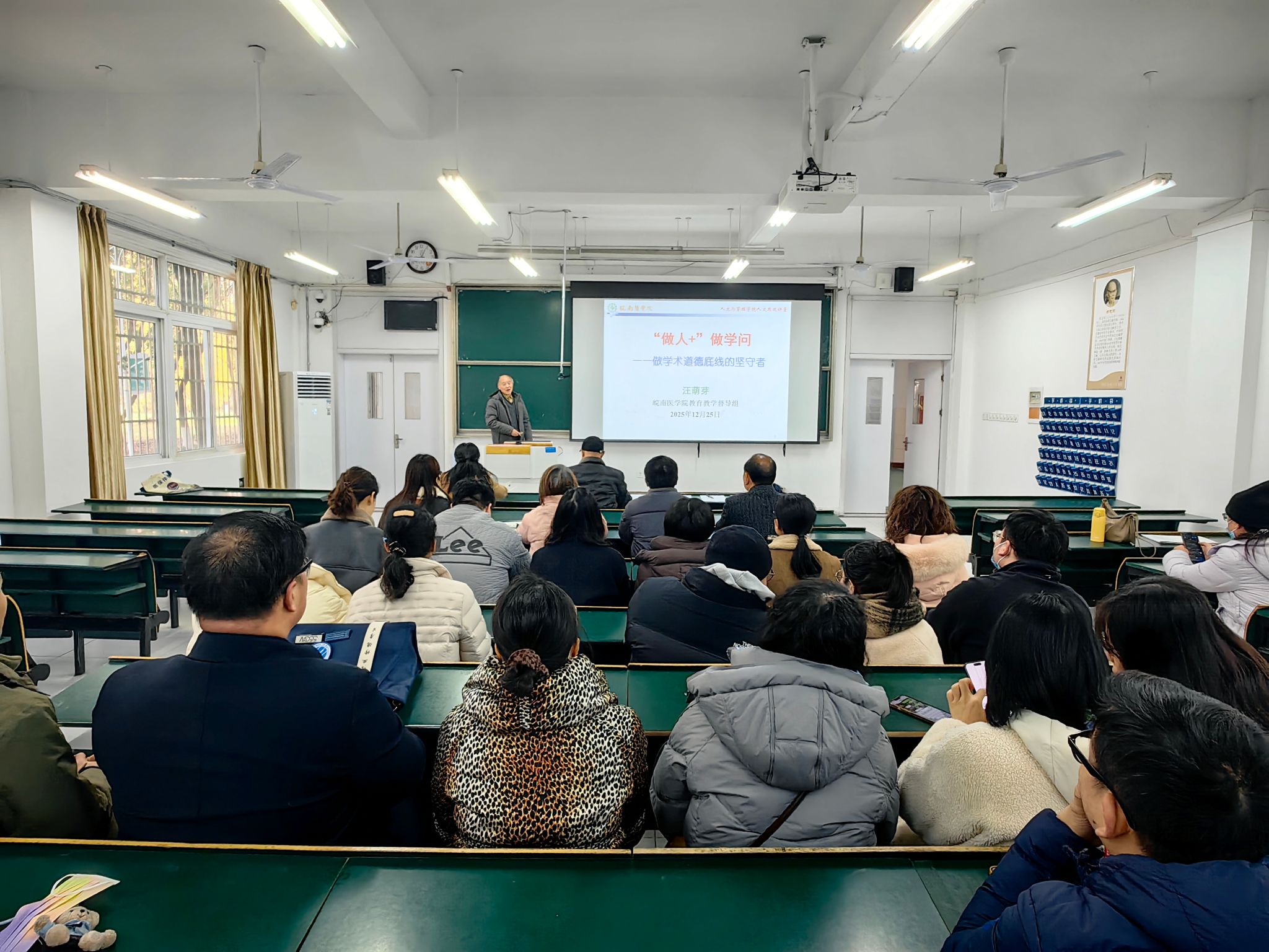 校教学督导组组长汪萌芽教授以《“做人+”做学问——做学术道德底线的坚守者》为主题,作了一场兼具思想深度与实践指引的学术道德专题报告。报告以“学术道德与学风建设”为核心脉络展开,以中国科学院院士邹承鲁的治学与奉献事迹切入,既介绍了邹承鲁自上世纪八十年代起为国家科技政策建言献策、推动我国科学事业健康发展所作的突出贡献,更援引其《我的科学之路》中“努力追求科学真理,避免追求新闻价值,跟踪最新发展前沿,不断提高水平,勤奋工作,永不自满”的治学准则,生动诠释了“做人的底色”是“做学问的根基”这一核心逻辑。 随后,汪萌芽系统梳理了学术道德的制度体系与典型案例,从2018年《教育部关于高校教师师德失范行为处理的指导意见》、2019年《学术出版规范——期刊学术不端行为界定》等政策文件,到中国科学院、国家自然科学基金委发起的学风建设倡议,清晰呈现了学术规范的历史性框架;同时结合学术不端反面案例,以“警示性样本”提醒广大教师,学术诚信是科研与治学的生命线,需时刻以道德底线约束自身行为。