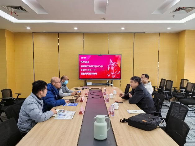 座谈会上,校企双方围绕“理论扎实、实践突出、适配产业”复合型人才培养展开深入交流。程栋梁全面介绍了公司发展历程、核心团队构成、核心业务布局及特色产品体系,重点阐述了公司在超声机器人与智能辅助诊疗系统领域的领先技术优势与战略发展规划,并表示,企业愿意结合自身技术优势与岗位资源,在学生实习实践、技术能力培养等方面开展深度合作,助力学校培养出更符合产业需求的人才。叶明全介绍学院专业设置特色、在校生规模、师资力量及实验实训条件,希望通过本次考察,深入了解合滨智能在超声人工智能辅助诊疗系统领域的技术应用与人才需求标准,把握主要岗位工程技术与实践能力要求,以及产业发展对复合型、应用型人才需求的现状和趋势;同时期待与合滨智能携手,探索“医工交叉”培养模式,精准对接产业人才需求,提升学生就业竞争力。吴自文、唐涛结合各自教学科研方向,与企业相关负责人就智能医疗系统数据处理、远程诊断智能技术应用等具体领域的合作可能性进行了细致交流。