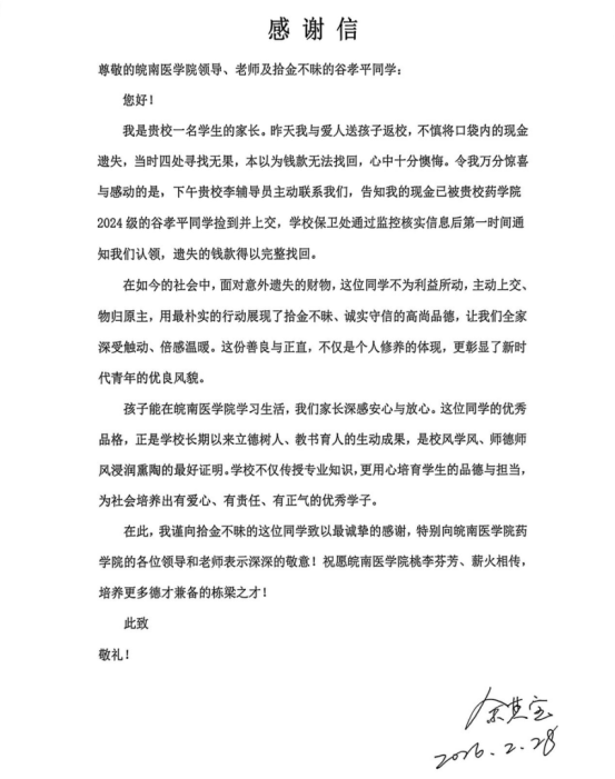 2 月 27 日,马鞍山市民余先生,同时也是我校学生家长,在送孩子返校时,不慎遗失现金,找寻无果。药学院谷孝平同学捡到后及时上交辅导员。经辅导员联系保卫处调取监控、核实情况,钱款顺利归还失主。谷孝平同学拾金不昧,以朴素的行动践行诚信初心,用青春担当诠释传统美德。余先生在感谢信中表示,“孩子能在皖南医学院学习生活,我们家长深感安心与放心。”