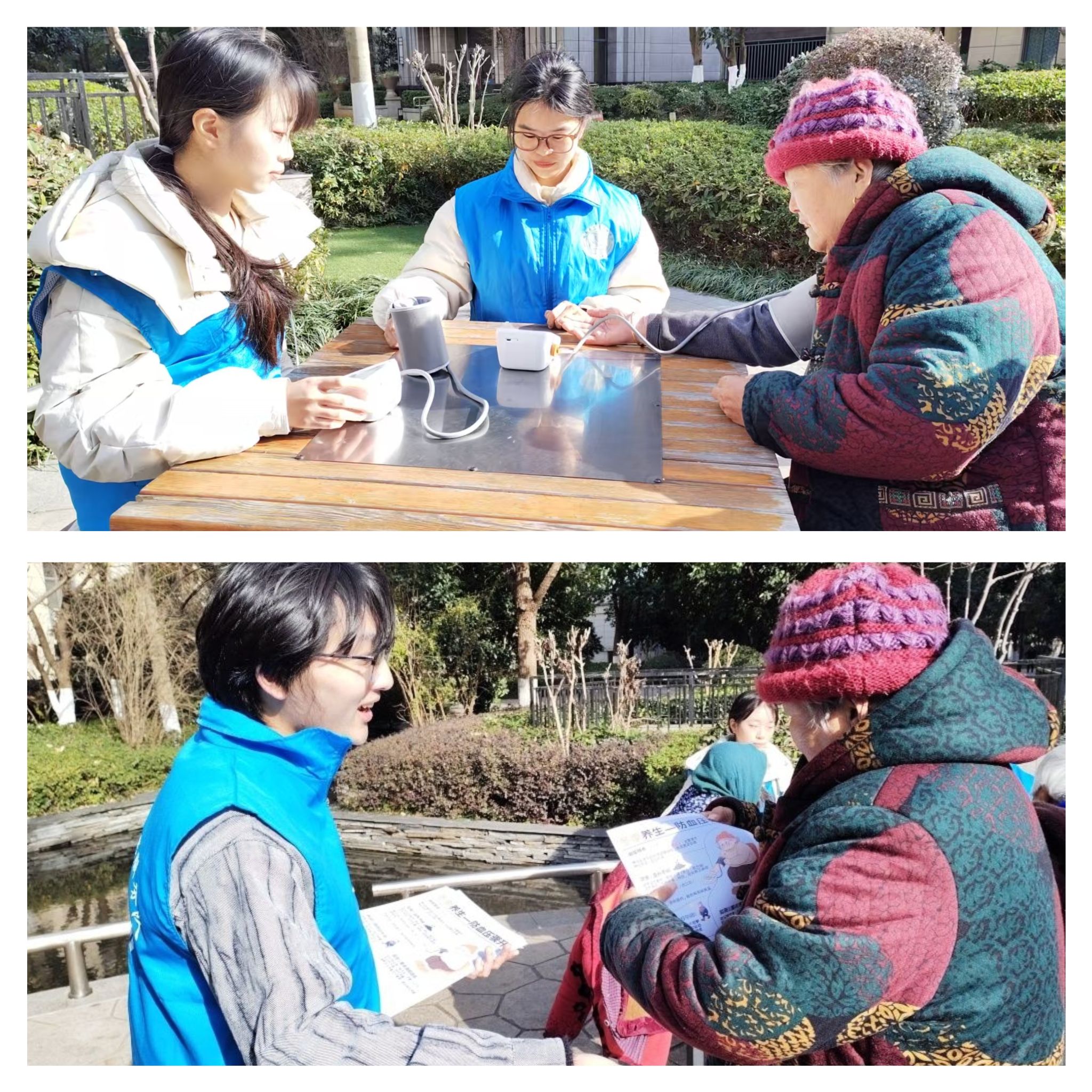 为助力 “健康中国” 战略实施,提升社区老年群体健康防护意识,“微尘”志愿服务队“医心绘言” 项目组走进芜湖市大学城社区诊所,开展 “免费血压检测 + 高血压防治科普” 公益实践活动,把专业医疗服务送到居民家门口。活动中,同学们为老年居民细致测量血压、记录数据,并结合结果提供个性化指导。项目组同步布设高血压防治科普海报,用通俗语言解读病因、症状与防护知识,帮助老人掌握血压管理方法。现场秩序井然、氛围热烈,老年居民对同学们的专业服务与暖心讲解给予高度认可。此外,部分学子加入“护佑安康”慢性病科普志愿队,赴芜湖市弋江区中沟社区开展冬季慢病防控指导。结合冬季血管收缩、血压易波动的季节特征,志愿者重点提醒老人规范服药、注意保暖,以专业知识守护老年群体健康。