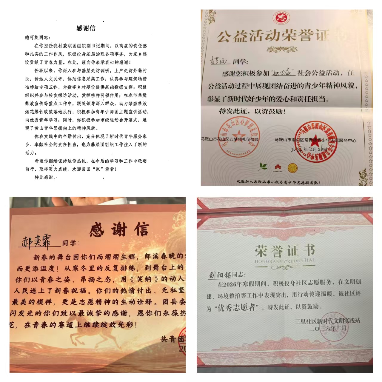 在此次寒假社会实践中,临床学子在不同岗位上践行“奉献、友爱、互助、进步”的志愿精神,多名同学因表现突出收获表扬信、感谢信及“优秀志愿者”等荣誉表彰。其中,毕叶蕊同学在皖南医学院第一附属医院(弋矶山医院)承担志愿者培训与管理、活动组织及资料整理等工作,以严谨作风和饱满热情保障志愿服务有序开展,获得医院团委高度认可。郭馨阳同学踊跃报名“江淮义警”,在颍上县公安局红星派出所参与反诈宣传与道路交通安全引导,累计服务时长62小时,将所学知识灵活运用于实践,为辖区安全宣传贡献青春力量。刘阳铭同学积极投身社区志愿服务,在文明创建、环境整治等工作中表现突出,获评社区“优秀志愿者”。方芝雨同学参加马鞍山市“她公益”社会公益活动,以团结奋进的精神风貌彰显新时代青年的爱心与担当。