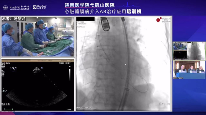 会场连线导管室进行手术转播,汤圣兴教授团队现场演示了一例高难度AR-TAVR手术,成功为一例重度主动脉瓣关闭不全患者植入一枚人工心脏瓣膜,瓣膜选型、植入深度、血流动力学完美,术后造影及食道超声提示零反流。根据中国瓣膜中心数据,第一附属医院主动脉瓣关闭不全的TAVR数量达53例,排名全国第一。