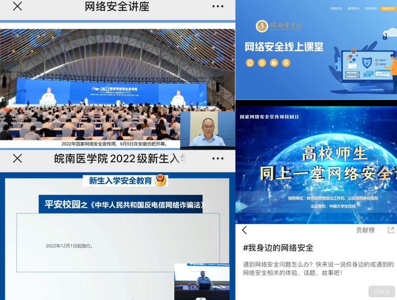 为深入贯彻落实习近平总书记关于网络强国的重要思想,增强师生网络安全意识,提高网络安全防范技能,我校联合芜湖市委网信办等多家单位,紧扣“网络安全为人民,网络安全靠人民”主题,通过线上线下相结合的形式,借助多渠道媒体传播,开展了2022年国家网络安全周系列主题教育活动,引导广大师生树立正确网络安全观,营造清朗的网络环境。