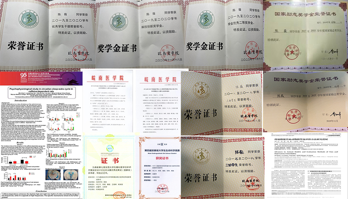 “青春由磨砺而出彩,人生因奋斗而升华”。在完成学业之余,陈薇加入了生理学省级重点学科指导的“启明星小组”,开展科学实验探索,主持省级大学生创新创业训练项目《咖啡因依赖大鼠昼夜节律性之睡眠觉醒周期的生理心理学研究》,项目已结题并完成论文初稿,目前该论文正在投稿中;以第一作者在中国生理学会2021年学术年会上发表中英文摘要1篇《psychophysiologicalstudyincircadiansleep-wakecycleincaffeine-dependentrats》,提交英文Poster;参加2020年安徽省生理学会学术年会,以第二作者身份参与发表中文摘要1篇,成为安徽省生理学会会员;以第三作者身份发表论文《疼痛抑郁共病动物模型及评价方法研究进展》;参加2019年ADI南京生理科学研讨会。2019年、2020年分别获人文与管理学院暨启明星小组大学生科研课题设计大赛二等奖、特等奖;2021年以第二完成人获第四届安徽省大学生生命科学竞赛一等奖、第七届全国大学生基础医学创新研究暨实验设计论坛分赛区(东部赛区)优秀成果。