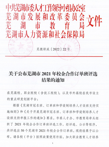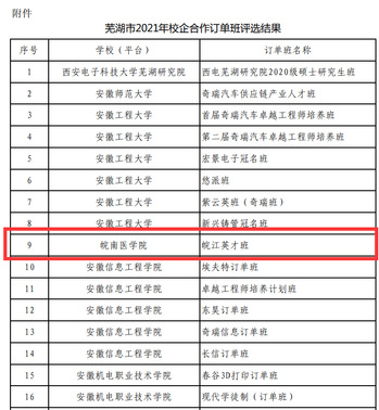6月28日,芜湖市2021年校企合作订单班评选结果公布,我校口腔医学院在校企多年合作的基础上,根据《芜湖市冠名班、订单班和学徒制培养人才设班支持实施细则》和《关于开展芜湖市冠名班、订单班和学徒制培养人才设班支持申报工作的通知》要求申报的“皖江英才班”成功获批校企合作订单班项目。