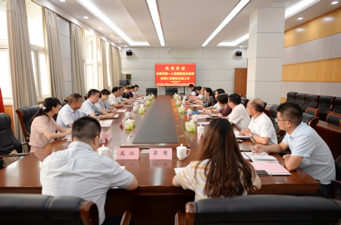 6月23日上午,合肥市第一人民医院院长唐智国、副院长宁仁德等来校洽谈合作事宜。校党委书记夏劲松、党委副书记吴金月、副院长郑兰荣分别会见了唐智国一行。