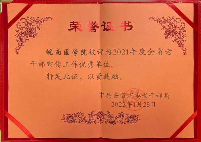 2021年是中国共产党成立100周年,我校老干部宣传工作坚持以习近平新时代中国特色社会主义思想为指导,认真学习贯彻党的十九大和十九届历次全会精神,不断打造宣传阵地,拓展宣传载体,弘扬正能量,发挥正导向,学校荣获“2021年度安徽省老干部宣传工作优秀单位”称号。