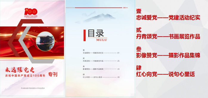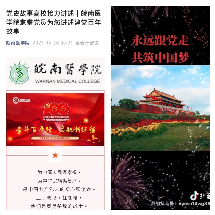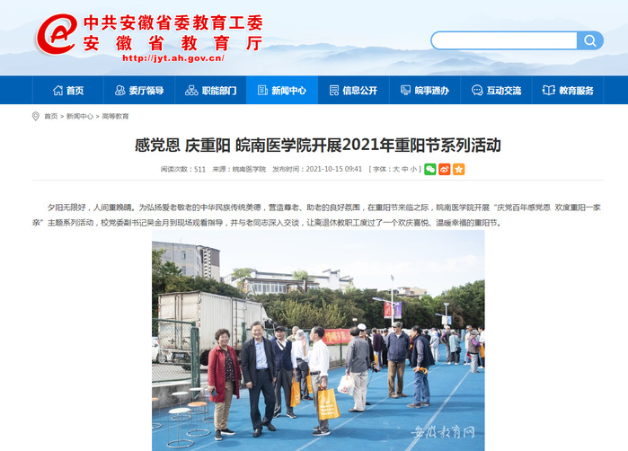 2021年,离退休工作处党委紧紧围绕庆祝中国共产党成立100周年开展系列活动,联合宣传部、学生记者团组织开展红色主题专访活动,受访者有参加抗战的90多岁离休干部,有参加抗美援朝的80多岁退休老兵,也有和平时期忠诚党的教育事业获得省级优秀共产党员的老干部、老教师;学校有47名老党员党龄到达50周年,学校通过多种方式颁发奖章、敬献鲜花,表达对老党员的深深敬意;积极组织老同志参加上级开展的活动,其中退休干部惠国胜、古绪华的书法和绘画作品入选省老干部局《伟大的旗帜》的书画作品集;编印画册《永远跟党走》,内容包括忠诚爱党、丹青颂党、影像赞党、红心向党等四个部分,并制作了“永远跟党走·共筑中国梦 庆祝中国共产党成立100周年”视频,表达了老同志对党的忠诚和热爱。此外,学校还结合老干部特点组织开展各种活动,其中“重阳节”系列活动新闻报道“感党恩 庆重阳 我校开展2021年重阳节系列活动”被安徽省教育厅网站登载。