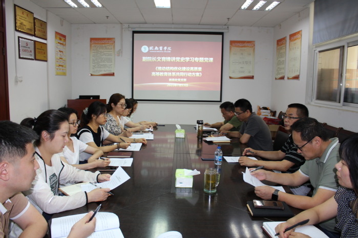 为进一步开展党史学习教育,深入贯彻习近平总书记关于教育的重要论述和全国教育大会精神,7月13日上午,副院长文育锋在教务处党支部党员活动室为支部党员作党史学习教育专题党课,支部全体党员参加学习。