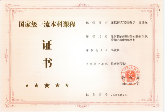 近期,根据教育部发布的《关于公布首批国家级一流本科课程认定结果的通知》(教高函〔2020〕8号)文件,我校国家虚拟仿真实验教学项目“原发性高血压性心脏病失代偿期心功能的改变”被教育部认定为首批国家级一流本科课程,这是我校在国家一流本科课程建设上取得的新突破。