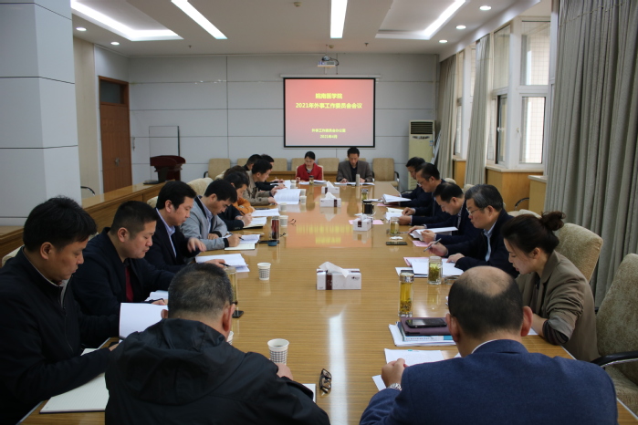 4月25日,学校外事工作委员会在行政会议室召开2021年第一次全体会议。校党委书记、外事工作委员会主任章尧,党委副书记、院长、外事工作委员会主任廖圣宝,副院长、外事工作委员会副主任吴金月,副院长、外事工作委员会副主任徐朝阳,以及外事工作委员会各成员部门、单位主要负责人参加会议。会议由章尧主持。