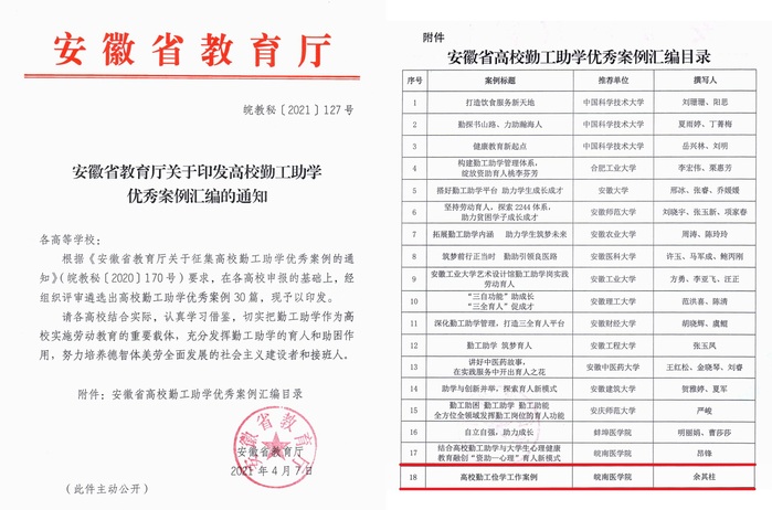 近日,安徽省教育厅公布了全省高校勤工助学优秀案例评选结果,共评选出高校勤工助学优秀案例30篇,其中我校麻醉学院昂锋的《结合高校勤工助学与大学生心理健康教育融创“资助—心理”育人新模式》和口腔医学院余其柱的《高校勤工俭学工作案例》2篇案例成功入围。据悉,本次评选仅有1所高校入围3篇案例、25所高校入围1篇案例。我校此次2人2篇案例入选全省高校勤工助学优秀案例,是学校继2017年获省学生资助民生工程绩效评价“优秀”等次、2018年获省学生资助工作“优秀单位案例典型”后,学生资助工作获得的又一佳绩,是对我校学生资助工作的肯定。