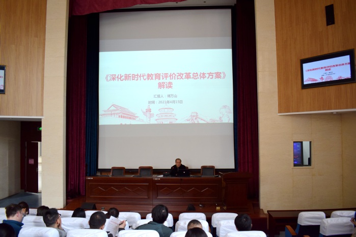 为扎实贯彻落实习近平总书记在党史学习教育动员大会上的重要讲话精神,进一步提高我校辅导员队伍党史学习理论水平和业务能力,4月15日下午,我校在逸夫科技楼一楼学术报告厅举办辅导员2021年校本培训(第三期)。此次培训内容主要包括党史学习教育和《深化新时代教育评价改革总体方案》解读两部分。培训由学工部部长傅万山主持,各学院学生工作秘书、全体专兼职辅导员和班主任参加了此次培训。