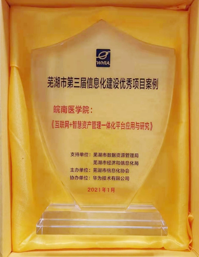 2021年3月26日下午,芜湖市信息化协会2020年会在华邑酒店举行。会议总结宣传了芜湖市各领域信息化成果,并在全市评选出25个信息化建设优秀项目案例。我校申报的《“互联网+”智慧资产管理一体化平台应用》位列其中,荣获“芜湖市第三届信息化建设优秀项目案例”。
