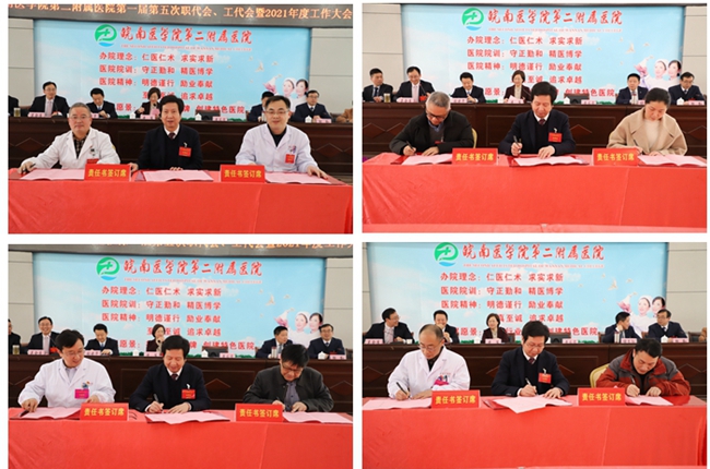 分代表团讨论结束后,大会主席团听取了四个代表团团长对报告讨论情况的汇报。下午3:30,大会举行闭幕式。闭幕式由二附院党委委员、纪委书记吴金庭主持。会议表决通过了全体代表审议的各项报告和文件,安排了院领导与临床、医技科主任签订2021年度目标责任书及院感安全管理责任书。