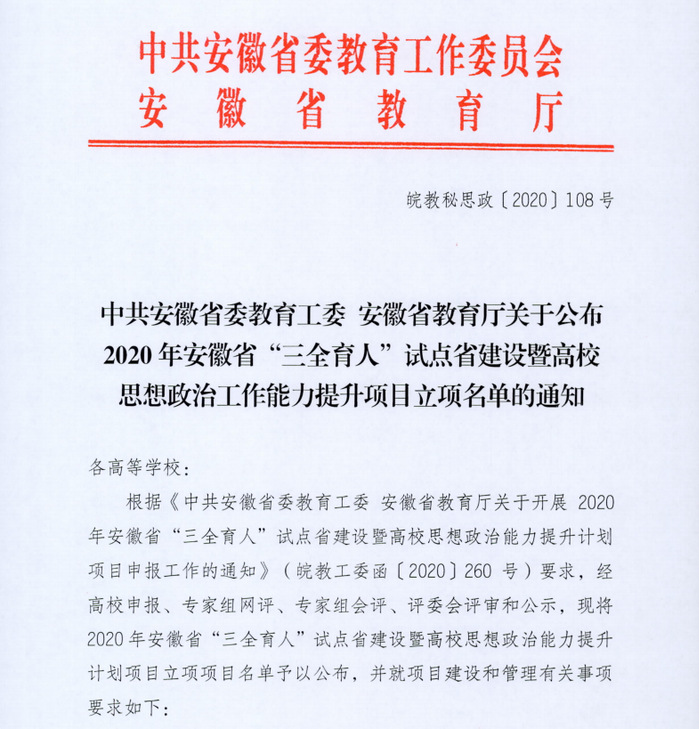 近日,中共安徽省委教育工委、安徽省教育厅下发了《中共安徽省委教育工委 安徽省教育厅关于公布2020年安徽省“三全育人”试点省建设暨高校思想政治工作能力提升项目立项名单的通知》(皖教秘思政〔2020〕108号)文件,经高校申报、专家组网评、专家组会评、评委会评审和公示,我校8个项目获批立项。具体如下:弘扬社会主义核心价值观名师工作室项目—思政教师类:“概论”课教学改革创新名师工作室(负责人:刘振宏);弘扬社会主义核心价值观名师工作室项目—辅导员类:“青禾”创新创业名师工作室(负责人:叶兰);思政课教学方法改革择优推广项目:思政课“六化一体”实践教学模式研究(负责人:陶庭马);思政课教学重点难点热点研究项目:习近平新时代治国理政大历史观融入“纲要”课教学的重点难点问题研究(负责人:汪峰);思政课教学重点难点热点研究项目:抗疫精神融入高校思政课教学的重点难点热点问题研究(负责人:郭超);思政课“示范一堂课”项目:如何阐释“中国特色社会主义法治道路”——《基础》课中“示范一堂课”建设(负责人:张婧);思想政治工作创新项目:“以学生为中心”实践育人路径探索与研究(负责人:余亮);中青年骨干队伍项目:高校思想政治工作中青年骨干队伍建设项目(负责人:汪峰)。