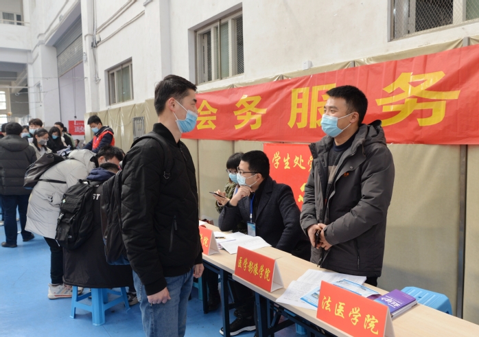 洽谈会现场气氛热烈,秩序井然。用人单位通过展示信息展板、播放宣传片和发放宣传册等多种方式向同学们详细介绍单位概况、福利待遇、人才需求和发展空间等基本情况,并对前来咨询同学的提问作一一解答,详细介绍应聘流程。毕业生手持精心准备的自荐书和简历来到展位前与用人单位进行沟通交流,并向心仪的单位积极推荐自己。部分低年级同学也加入了求职的人群进行观摩学习,提前感受就业氛围,尽早规划自己的职业生涯,为将来就业做好准备。各学院负责人和毕业班辅导员心系就业工作,积极与用人单位交流、沟通,介绍学院的专业特色,向用人单位推介毕业生,并在会场设立学院对接区,帮助同学们科学定位,理性选择就业单位。洽谈会现场处处可见志愿者们忙碌的身影,他们为招聘单位和前来求职的同学提供热情周到的服务,展现了皖医学子良好的精神风貌。