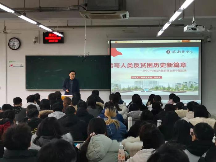 廖圣宝围绕“谱写人类反贫困历史新篇章”主题,通过认真梳理新中国成立以来中国共产党扶贫脱贫事业的演进历程,以生动事例、丰富内容和详实数据,全面展示了我国脱贫攻坚取得的巨大成就,重点讲授了党的十八大以来以习近平同志为核心的党中央从全面建成小康社会大局出发,实施精准扶贫精准脱贫方略,全面打赢脱贫攻坚战,引导学生充分认识中国特色社会主义制度的优越性,勉励同学们厚植家国情怀,自觉听党话跟党走,把“爱国情、强国志、报国行”融入到实现中华民族伟大复兴中国梦的奋斗之中,乘势而上、凝心聚力,以青春之我、奋斗之我,为祖国建设添砖加瓦。整个授课过程坚持把知识传授和价值引领相统一,既注重启发思考,更强化价值引领,春风化雨地给学生以理论滋养和精神力量,教育引导大学生进一步增强“四个意识”、坚定“四个自信”、做到“两个维护”。