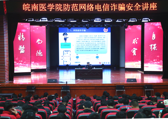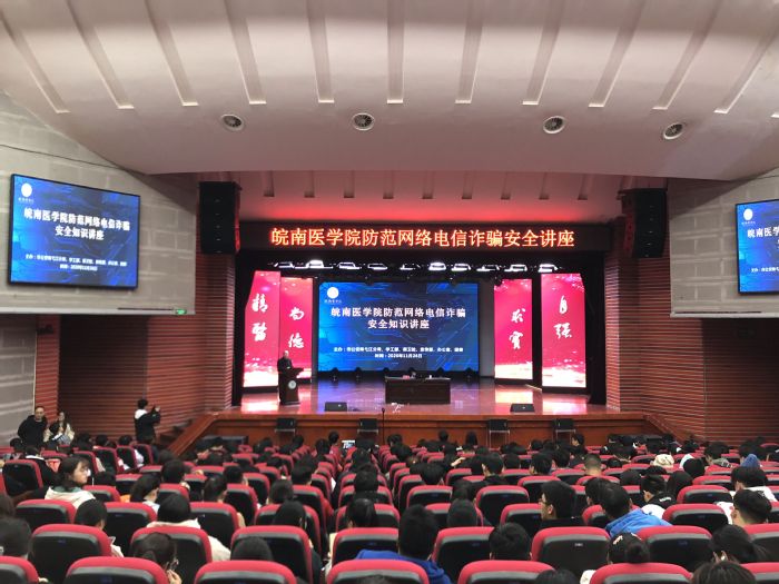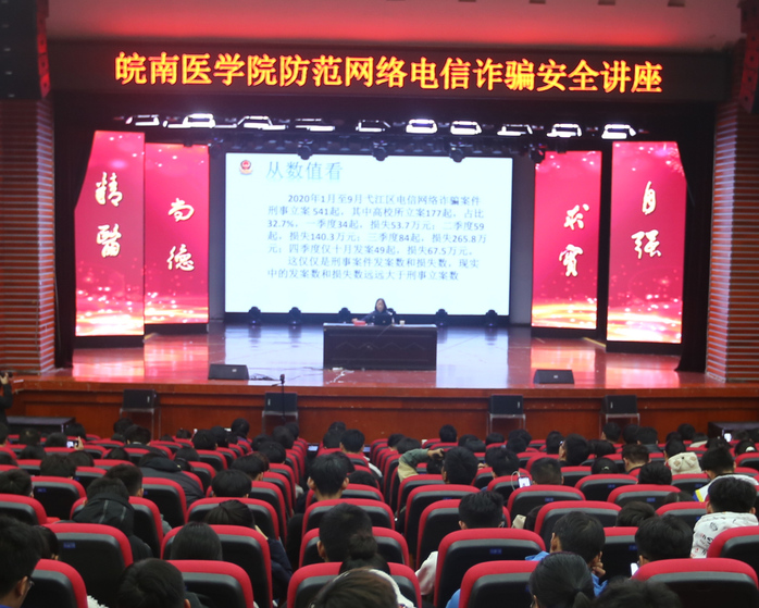 为提高大学生识别和防范电信诈骗的能力,增强学生安全意识,加强校园安全建设,11月27日晚,我校联合芜湖市公安局弋江分局在大学生活动中心举办了防范网络电信诈骗安全知识讲座。讲座由学工部部长傅万山主持,全体专兼职辅导员、班主任和学生代表现场聆听。此次讲座由学工部、保卫处、宣传部、办公室、团委主办,并通过易班平台进行全程直播。