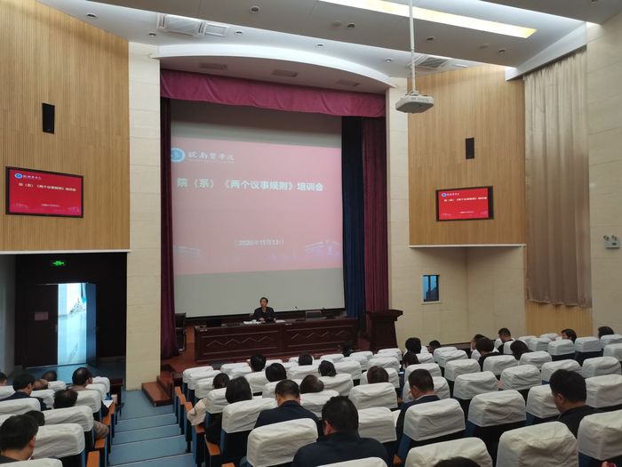 为进一步发挥二级学院党组织政治核心作用,健全完善二级学院党组织议事决策机制,11月13日下午,学校在逸夫科技楼报告厅开展二级学院党组织“两个议事规则”专题培训。全体处级干部参加培训,组织部部长方国庆作专题辅导。