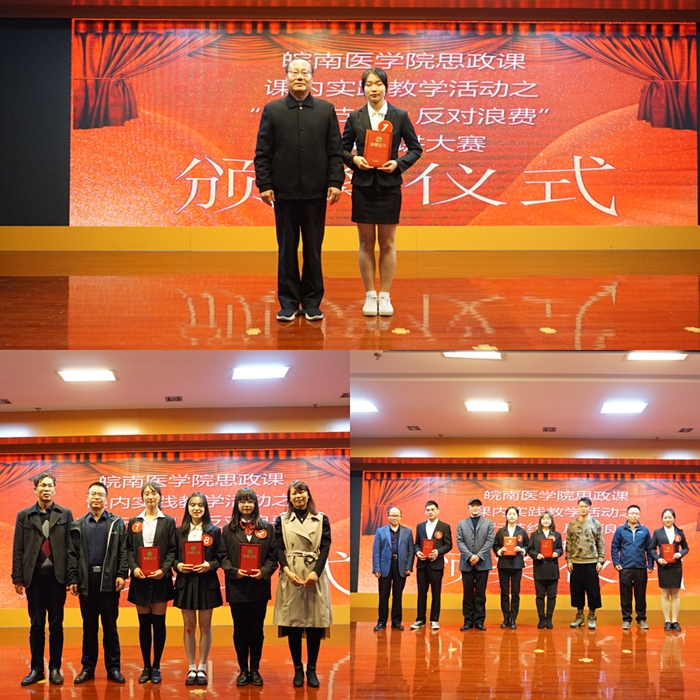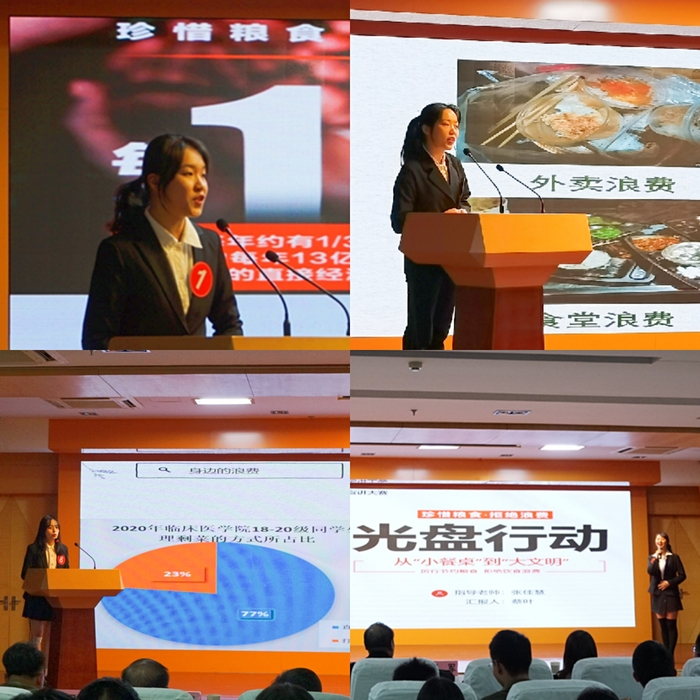 为进一步深入学习贯彻习近平总书记关于制止餐饮浪费行为的重要指示精神,引导大学生切实增强节约粮食、杜绝浪费的思想自觉和行动自觉, 11月9日晚,我校在图书馆三楼学术报告厅举办思政课实践教学之“厉行节约 反对浪费”PPT宣讲大赛。此次活动由马克思主义学院和临床医学院联合举办,学生处处长傅万山、教务处副处长陈祥攀、宣传部校报编辑部主任汪峰等担任评委,马克思主义学院、临床医学院的相关负责人、老师和300余名大学生共同观看了大赛。