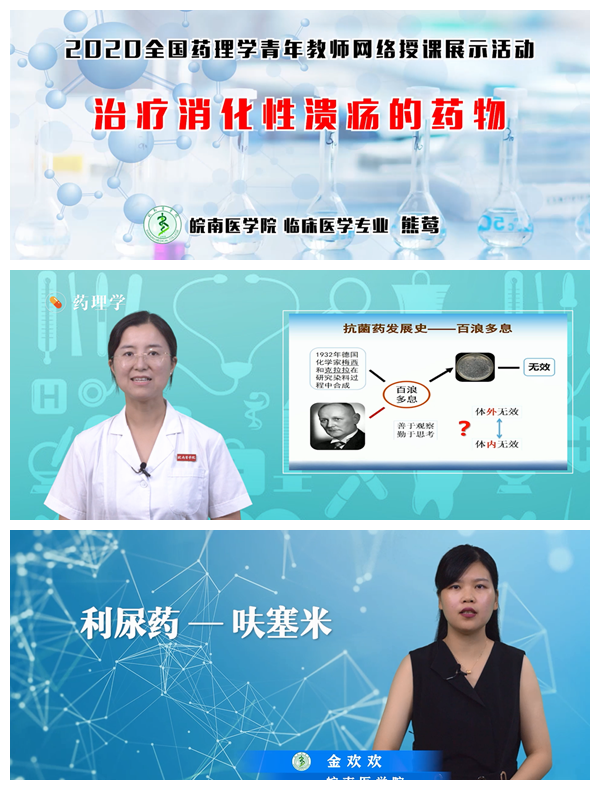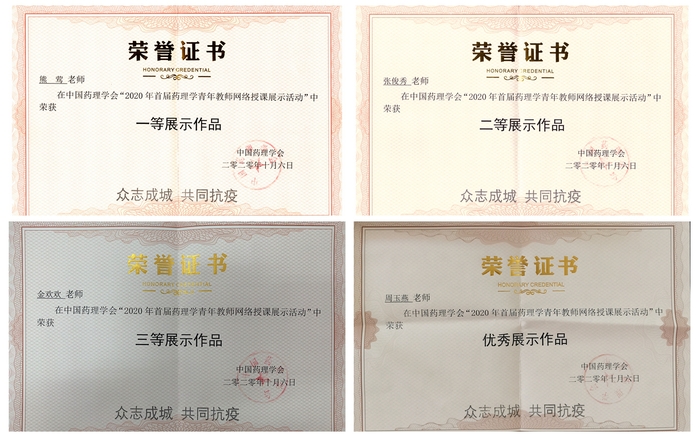 2020年,新冠肺炎疫情全球蔓延。受疫情影响,全国各高校2020年春季学期课程均采用了线上教学的形式授课。为鼓励药理学教学工作者积极开展“药理学”网络教学,促进教师间的交流,提高药理学线上教学水平,中国药理学会于2020年3月-9月举办了“2020年首届药理学青年教师网络授课竞赛与展示活动”。本次活动由中国药理学会主办,教学与科普专业委员会承办,来自四川大学、首都医科大学、天津医科大学及吉林大学等23所高校的36位教师参加了竞赛与展示活动。经过中国药理学会专家委员会评审、教学与科普专业委员会主任委员和副主任委员审阅等环节,共评选出一等展示作品3个、二等展示作品7 个、三等展示作品10 个和优秀展示作品16 个。我校药学院熊莺、张俊秀、金欢欢和周玉燕四位教师参加了此次青年教师网络授课竞赛与展示活动,获一、二、三等和优秀参赛作品各1项。