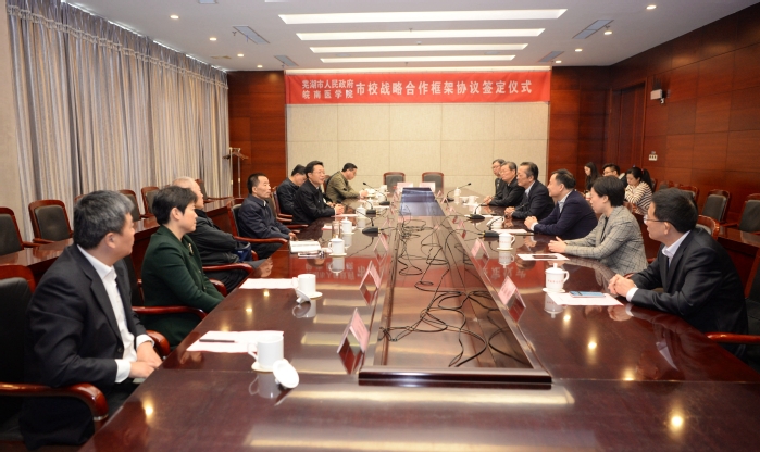 章尧对芜湖市长期以来对学校的关心和支持表示感谢,对芜湖市经济社会发展优势及取得的成绩给予赞誉。章尧指出,服务国家重大战略需求和地方经济社会发展,是学校应尽的社会责任和义务。与地方政府开展合作共建,对学校而言也是全面深化改革、加大开放力度、强化内涵建设、推动高质量发展的重要举措。此次校地合作战略的签定,标志着双方合作进入一个新的历史阶段,希望双方能以合作共建为契机,进一步深化合作的深度与广度,积极探索形成全方位、高起点、深层次的融合发展之路,共同推动健康芜湖发展战略及皖南医学院“国内有影响、特色鲜明的区域性高水平医科大学”建设,为人民群众提供更高水平、更加满意的医疗卫生服务。