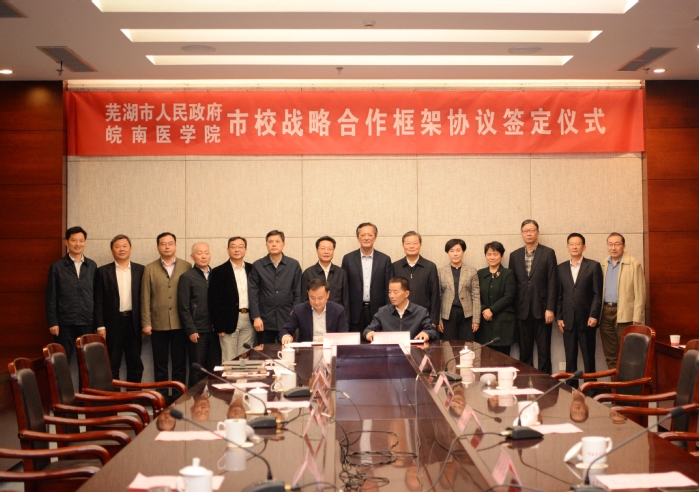 会上,廖圣宝和贺东分别代表皖南医学院与芜湖市人民政府签署战略合作协议。