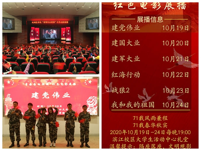 校团委举办红色电影展播活动,10月19日-24日每晚7点在大学生活动中心礼堂播出《建党伟业》《建国大业》《建军大业》《战狼2》《红海行动》和《我和我的祖国》等经典影片,全校师生自行前往观看,追忆71年的红旗猎猎和铁骨铮铮,同温71年波澜壮阔和风雨兼程。