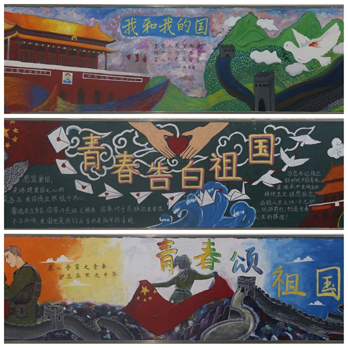 各学院团委紧紧围绕新中国成立71年的主题,在滨江校区1号楼、2号楼的22间教室内绘制精美板报。一幅幅主题鲜明、内容充实、构思新颖、设计美观的作品,是同学们在时间画卷上书写的赤子情深,在历史苍穹下描绘的盛世中华。