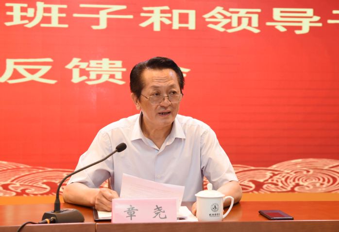 章尧代表学校领导班子作表态发言,他首先对上级组织给予我校的关心指导以及对考核组的辛勤工作深表谢意。章尧指出,这次省委对皖南医学院进行综合考核,是对学校2019年度党政工作的一次全面考察和系统验收,反馈的意见符合学校实际,指出的问题客观中肯,提出的建议具有很强的针对性和指导性,校党委将诚恳接受、照单全收、坚决整改。就进一步抓好省委综合考核整改工作落实,章尧强调,要坚持问题导向,全面落实整改任务;要坚持标本兼治,建立健全长效机制;要注重工作结合,不断深化整改成效。最后,章尧希望全体教职医护员工同心同德、同向同行,以整改补短板、提质效、促发展,推动学校党的建设和事业发展再上新台阶,为党和人民交上一份满意的答卷。