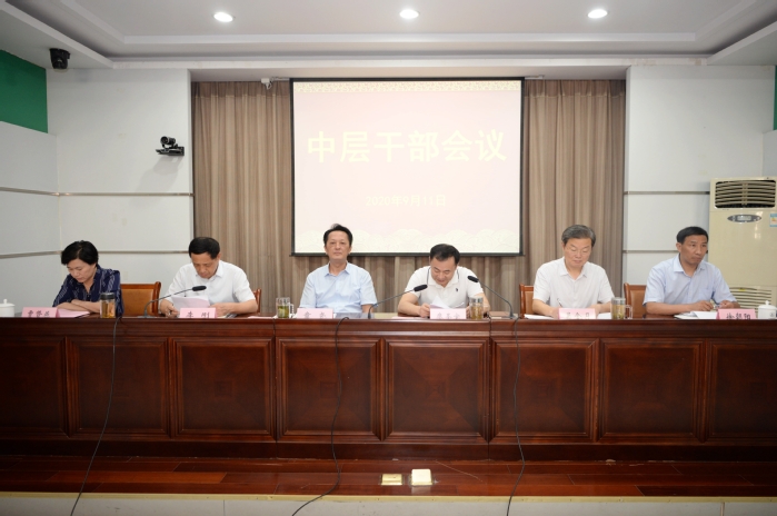 2020年9月11日,我校在图书信息楼视频会议室召开中层干部会议,总结暑期工作,部署新学期工作。校领导章尧、廖圣宝、李刚、吴金月、贾贤燕、徐朝阳和全校处级干部参加会议。会议由党委副书记李刚主持。