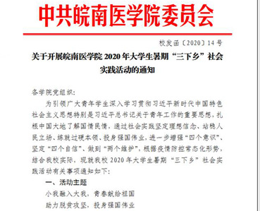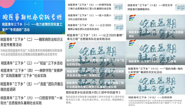 2020年暑期,校团委根据疫情防控常态化的形势,积极探索“互联网+社会实践”新模式,各级团学组织纷纷响应号召,根据学生家乡疫情防控和防汛救灾形势做好整体部署和动态调整,指导学生以“云组队”的形式组建了703支“三下乡”社会实践团队,团队总数相比去年同期增长15.8%。各实践团队精心谋划活动内容,线上线下深度融合,1.1万余名皖医青年通过丰富的“云学习”、“云调研”、“云宣讲”、“云访谈”和扎实的进社区、进乡村、返家乡社会实践,围绕“青年大学习”行动、防汛救灾志愿服务、疫情防控复工复产、脱贫攻坚乡村振兴、新时代文明实践志愿服务等专题,开展广泛深入、知行合一的暑期“三下乡”社会实践活动。