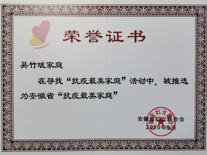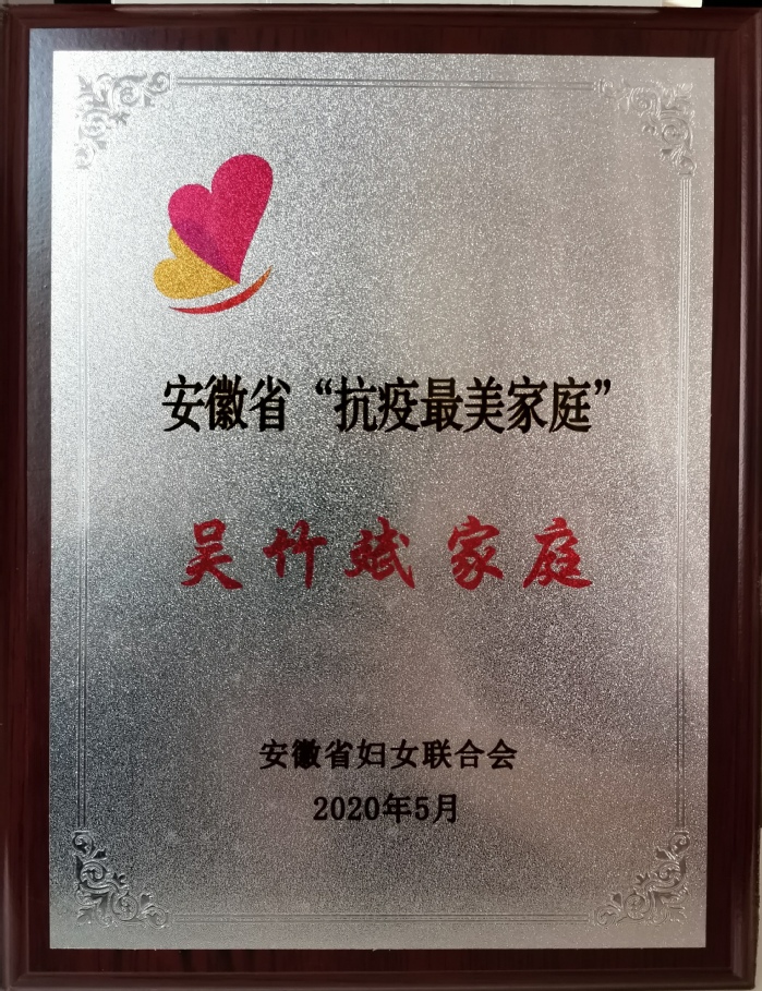 近日,由省妇联主办的2020年安徽省“抗疫最美家庭”评选结果揭晓,我校第二附属医院吴竹斌家庭获此殊荣。