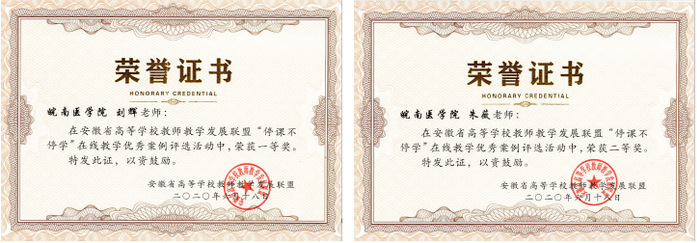 为充分展示广大教师疫情防控期间全心全力做好教学工作的良好精神风貌,推广在线课程优秀案例,共享线上教学经验,我校组织教师积极参加安徽省高等学校教师发展联盟“停课不停学”在线教学优秀案例评选活动。近日,联盟公布了评选结果,共评选出一等奖9项、二等奖34项、三等奖36项,我校推荐的两个案例喜获佳绩,其中刘辉老师荣获一等奖,朱薇老师荣获二等奖。