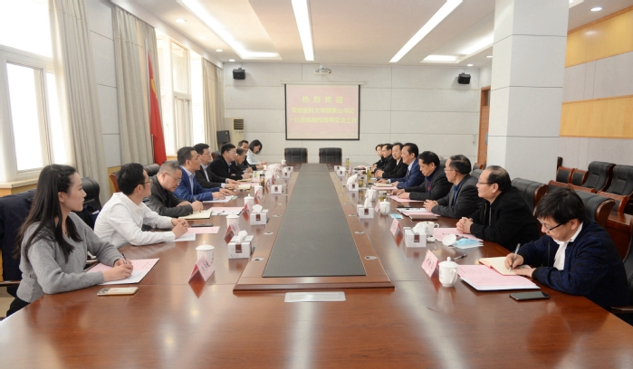 4月24日下午,安徽医科大学党委书记顾家山、党委副书记刘群英等一行9人来我校考察交流工作,校党委书记章尧、党委副书记李刚在党委会议室热情接待了来宾。办公室、组织部、人事处、学生处、外事处、团委等部门负责人参加会议。