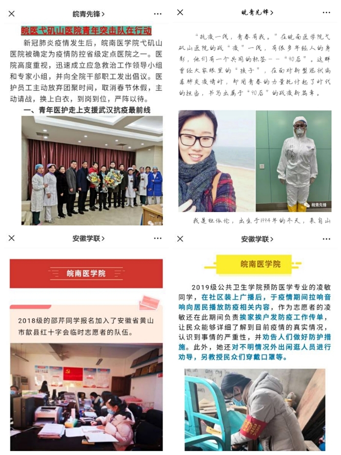 我校青年师生充分发挥医学专业特长,助力疫情防控的各项服务保障工作。他们中有白衣执甲、驰援武汉的最美逆行者,有坚守一线、守护江城的附院医护员工,还有闻令而动、服务基层的青年突击队,一个个先锋模范、一面面鲜红旗帜冲锋在疫情前线,他们用生命守护生命,用无畏践行誓言,将皖医人“精医、尚德、求实、自强”的精神盛开在了人民最需要的地方,受到中国青年网、中国青年报、新浪网、皖青先锋和安徽学联等媒体宣传报道。其中,援鄂医疗队员、第一附属医院颜浩和杨尚志获“安徽省向上向善好青年”提名奖。
