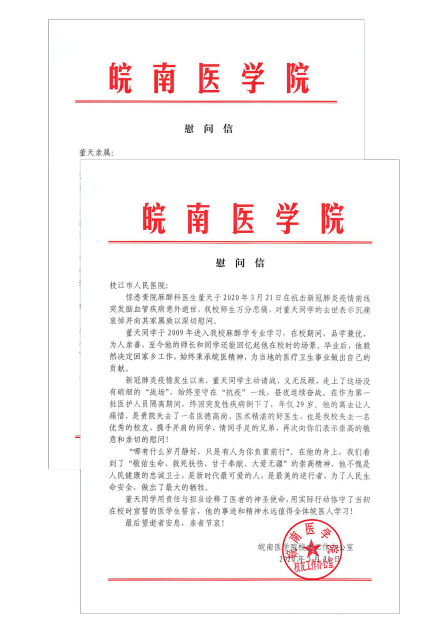 得知董天不幸逝世的噩耗后,现任北京协和医院麻醉科主任、中华医学会麻醉学分会主委的我校1983届校友黄宇光教授,武汉协和医院原副院长、现任麻醉与危重症研究所所长的1982届校友姚尚龙教授表示深切悼念,“我们为年轻校友董天的不幸离去而悲伤,我们也为有这样一位可爱英勇的校友而倍感自豪和骄傲!”