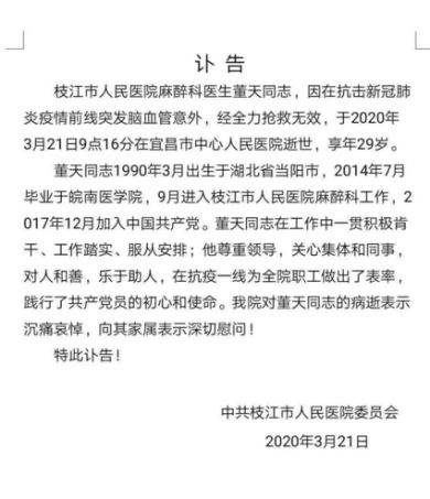 3月21日,一个让人深感悲痛的日子,我校2014届校友、枝江市人民医院麻醉科医生董天,因在抗击新冠肺炎疫情前线突发脑血管意外,经抢救无效,于9时16分在宜昌市中心人民医院不幸逝世,生命永远定格在了29岁。