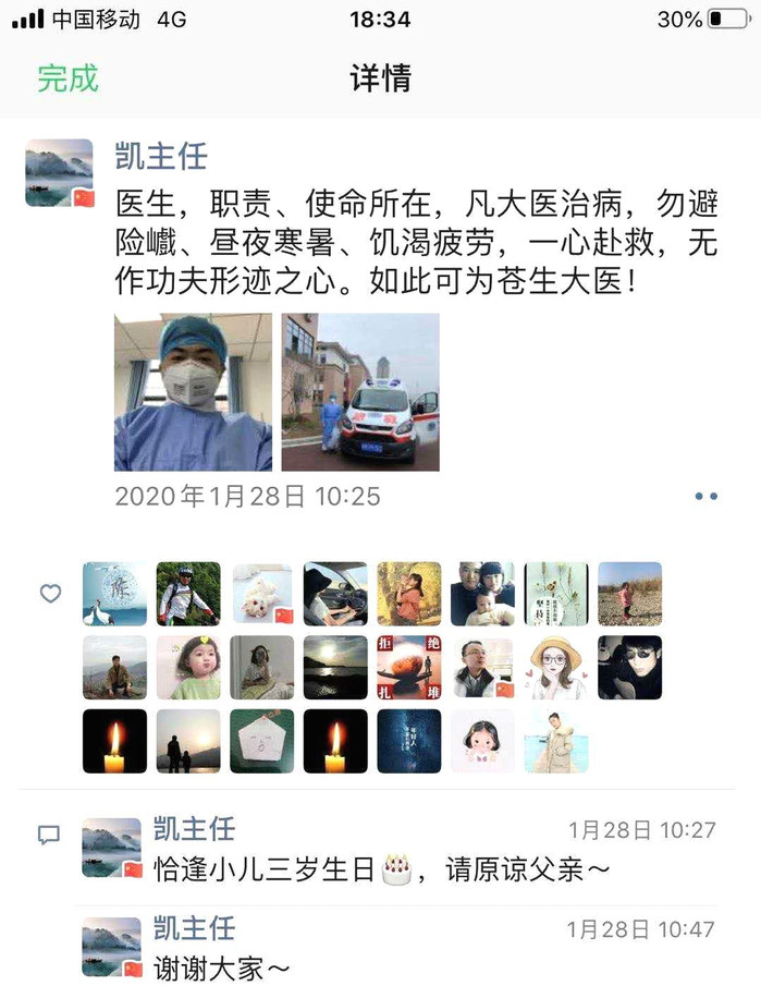“医生,职责、使命所在,凡大医治病,勿避险巇、昼夜寒暑、饥渴疲劳,一心赴救,无作功夫形迹之心。如此可为苍生大医!”这是张凯1月28日发布的一条微信朋友圈。“恰逢小儿三岁生日,请原谅父亲”,原来那一天也刚好是小儿子的生日。医者仁心与父爱如山此刻交融于张凯心中,不禁让人潸然泪下。