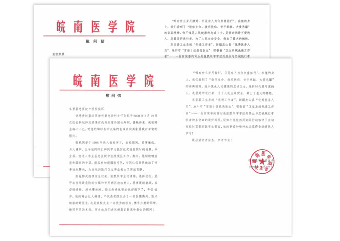 就在家乡抗疫斗争取得阶段性胜利的时刻,就在胜利的曙光即将到来之时,就在即将踏出隔离病房的前一天,他却倒下了!我校2003届校友、东至县总医院中医院院区重症医学科主任兼急诊科主任张凯因劳累过度,于2020年3月19日不幸离世,献出了年仅41岁的宝贵生命。