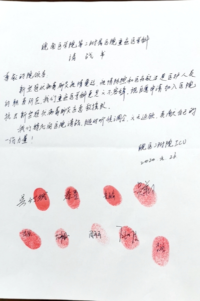省卫健委组派安徽省医疗队援助湖北应对新型冠状病毒感染的肺炎疫情的通知刚刚下达,面对时间紧、任务重的情况,二附院重症医学科立即响应,书写请战书。薄薄一张纸,满满医者情,一个个鲜红的手印,犹如满腔的热血,彰显着他们无私奉献的神!