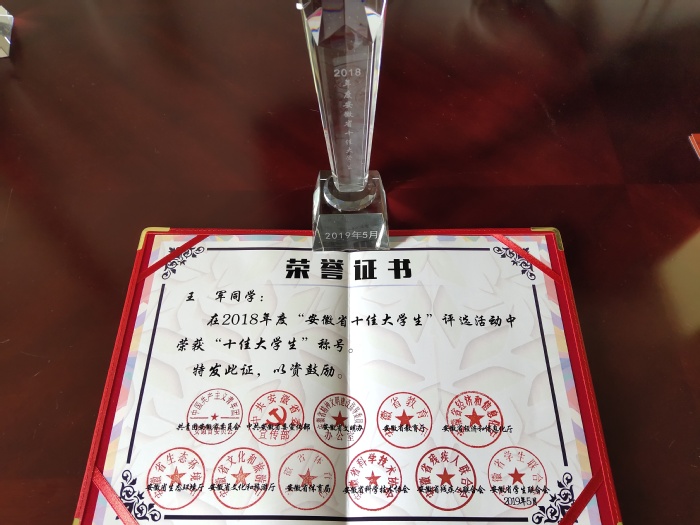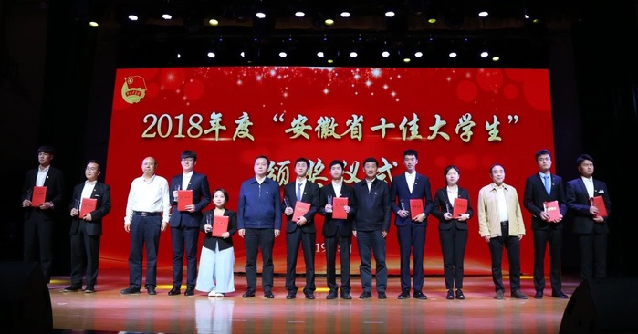 青春心向党,建功新时代。5月5日,2018年“安徽省十佳大学生”颁奖典礼在安徽大学举行,我校王军同学喜获“安徽省十佳大学生”荣誉称号(道德示范类别),这也是继丁婕(2015年志愿服务类别)、刘然(2016年自强奋斗类别)后,我校学子第三次获此殊荣。