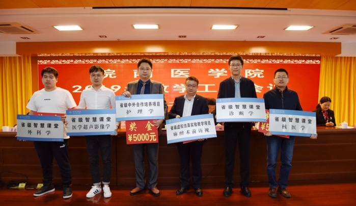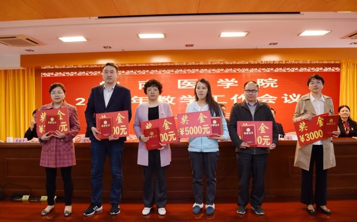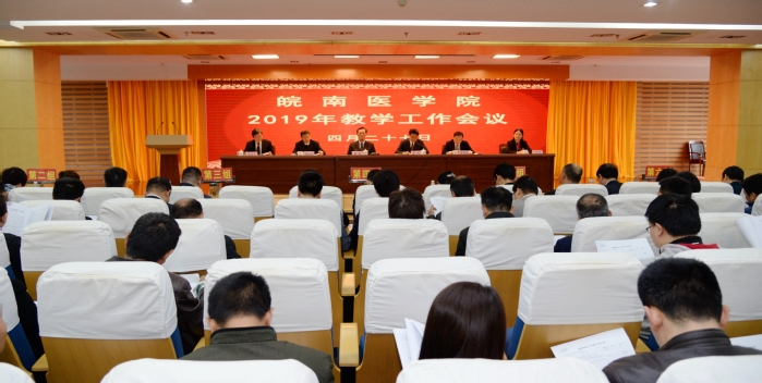 立德树人育英才,勇立潮头谱华章。在全校上下贯彻落实全国、全省教育大会和新时代全国高等学校本科教育工作会议以及习近平总书记在学校思想政治理论课教师座谈会上重要讲话精神之际,2019年4月27日,皖南医学院2019年教学工作会议隆重召开。上午九时开幕式在学术报告厅举行。党委副书记、院长章尧,党委副书记李刚,纪委书记刘人人,副院长廖圣宝、吴金月和郑兰荣出席会议。全校处级干部,附院教育处主任、副主任、科教科科长,各学院教学督导员、教学秘书,各教研室主任、副主任,各实验实训中心主任、副主任,教授(含附院),临床(护理)学院领导及科教科(护理部)负责人,教务处科级以上人员;2017年度校级教学成果奖、教学名师、教坛新秀获奖教师;2017年度和2018年度省级质量工程集体项目、省级教学成果奖、省级教学名师、省级教坛新秀获奖教师以及教师代表共300余人参加大会。开幕式由李刚主持。
