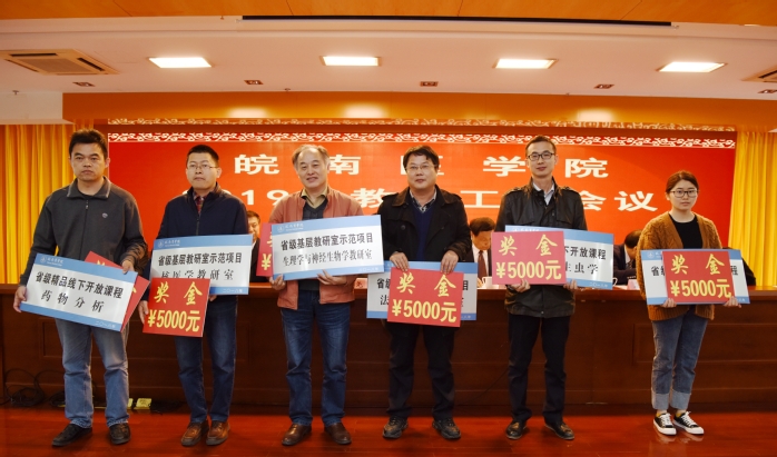 刘人人宣读2017年度省级质量工程集体项目、教学成果奖,校级教学成果奖、教学名师、教坛新秀表彰人员名单。廖圣宝宣读2018年度省级质量工程集体项目、教学成果奖、教学名师、教坛新秀表彰人员名单。校领导分别为各个项目获得者和负责人进行了颁奖。